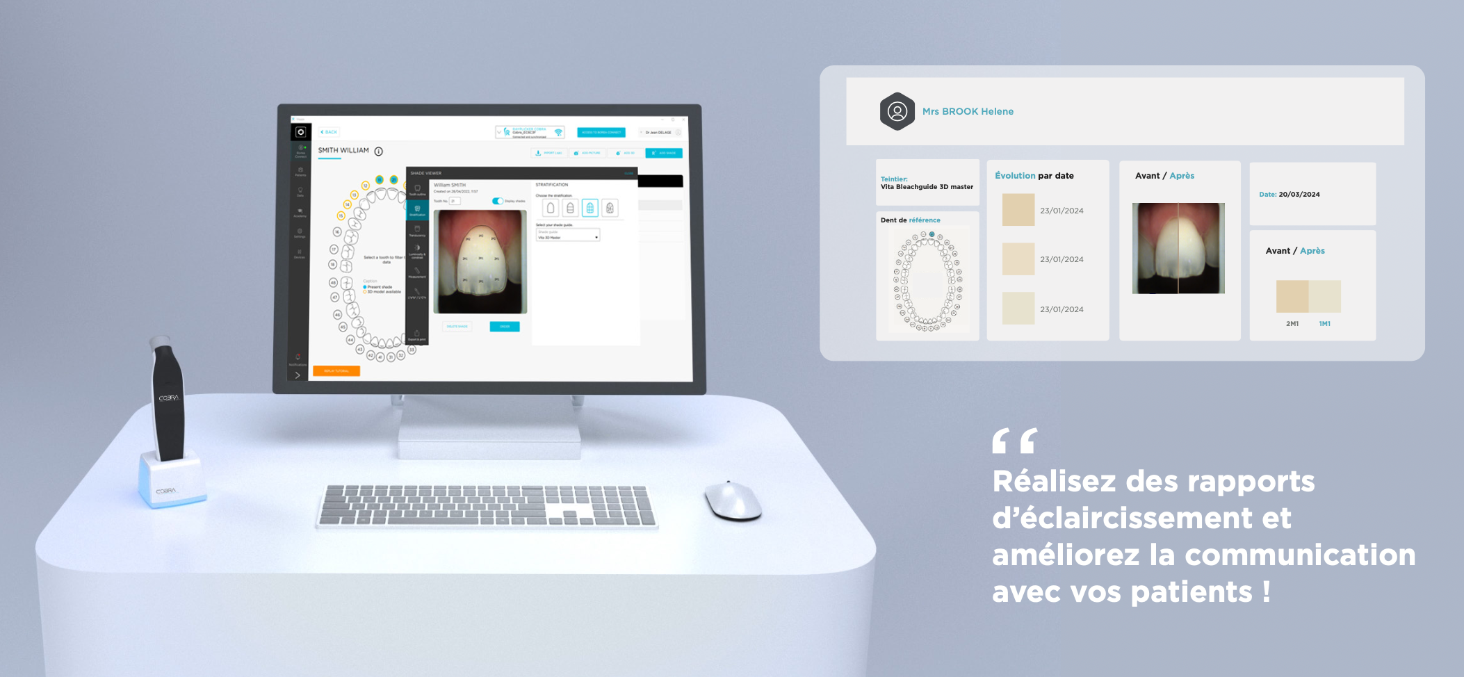 Avec son flux 100% numérique, COBRA facilite la communication entre le praticien et le laboratoire. Il capture la teinte réelle de la dent, génère une cartographie précise (1/3/9 zones) ainsi que la translucidité, et transmet instantanément les données esthétiques au laboratoire.
