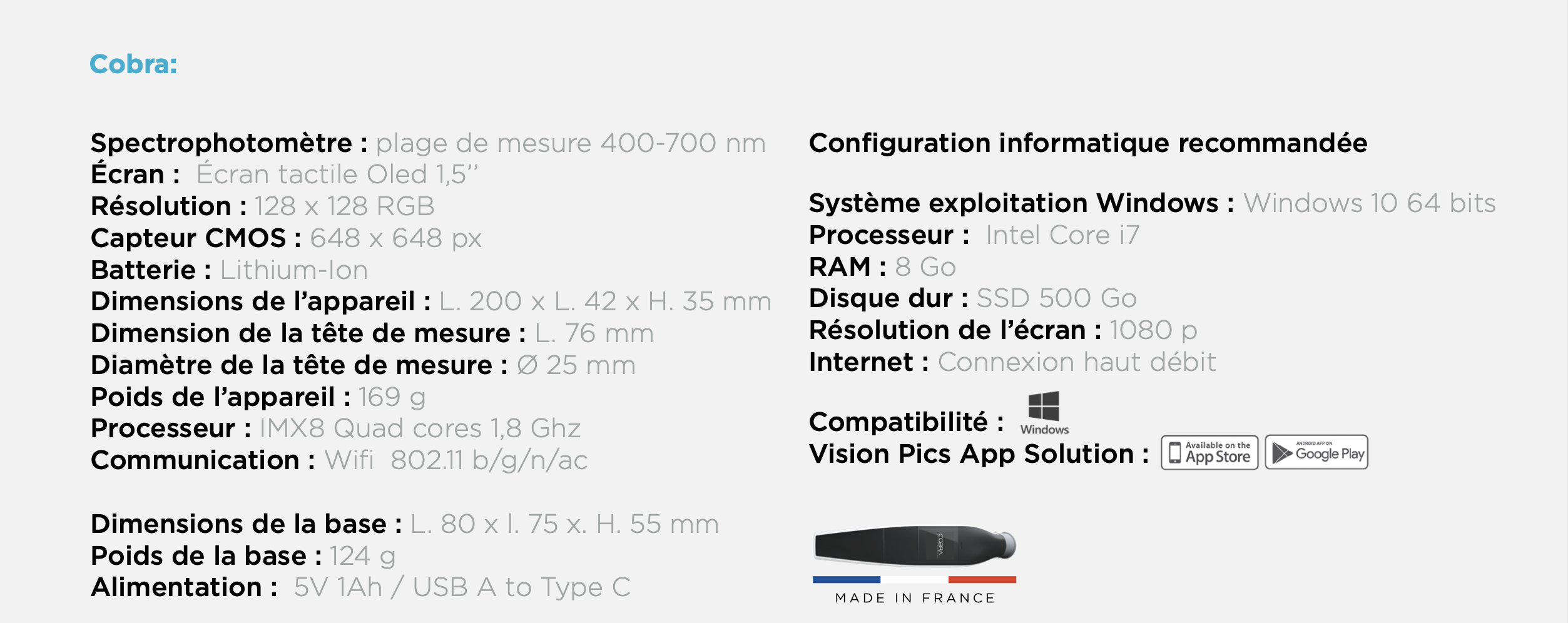 Ergonomique et intuitif, COBRA dispose d’un écran OLED, de capteurs multispectraux haute résolution et d’embouts stérilisables. Il élimine les incertitudes du teintier manuel et réduit significativement les retouches et remakes.